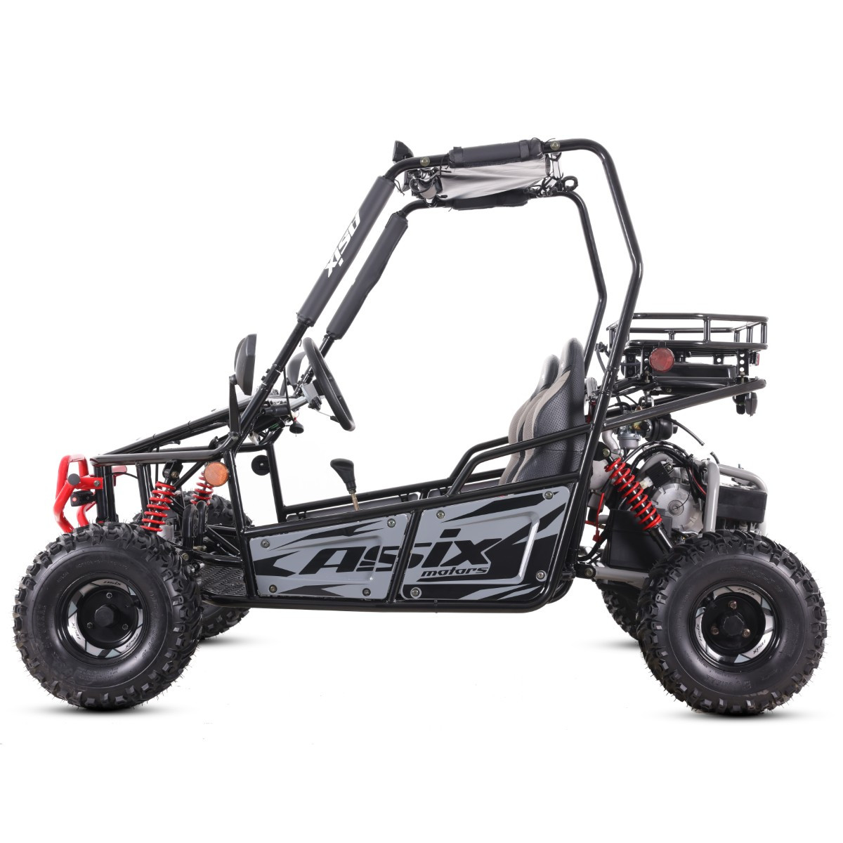 ASIX BUGGY 125 to pojazd z czterosuwowym silnikiem o pojemności 125cm3. Przeznaczony jest dla dzieci od 130cm wzrostu. Wyposażony jest między innymi w: oświetlenie LED, dodatkowe panele LED, gniazda USB, czteropunktowe pasy bezpieczeństwa, wyświetlacz położenia biegów oraz hamulce hydrauliczne. Pojazd występuje z półautomatyczną skrzynią biegów + wsteczny (3+1). BUGGY zestawiony jest na kołach 7-calowych