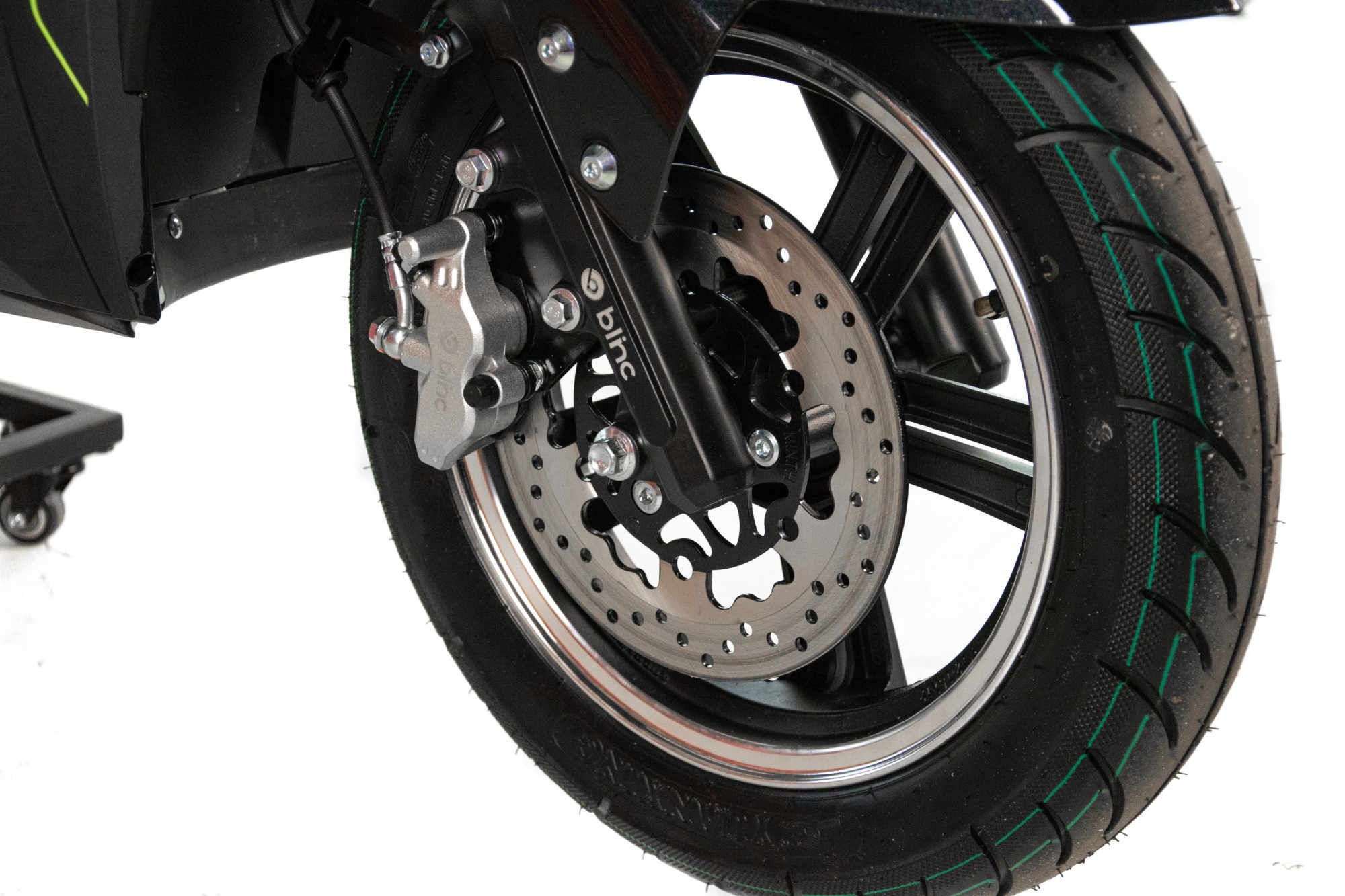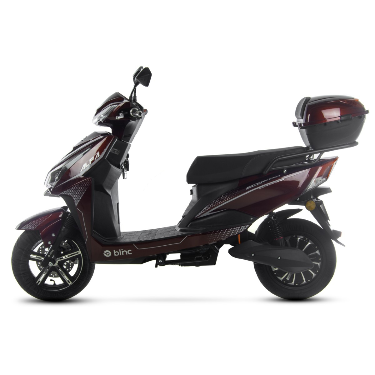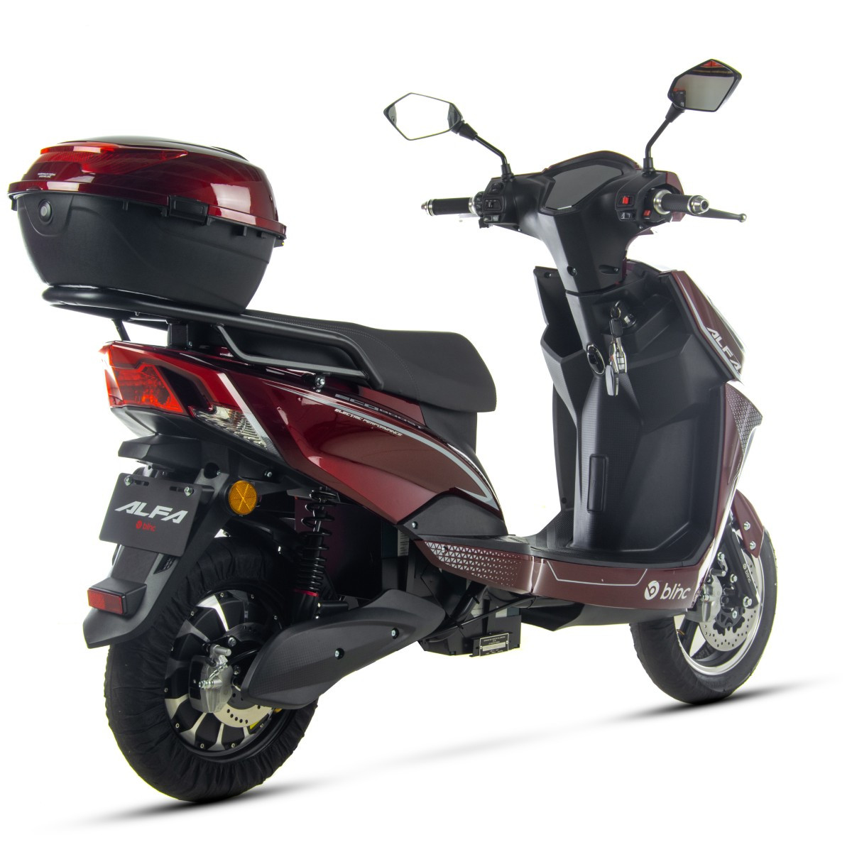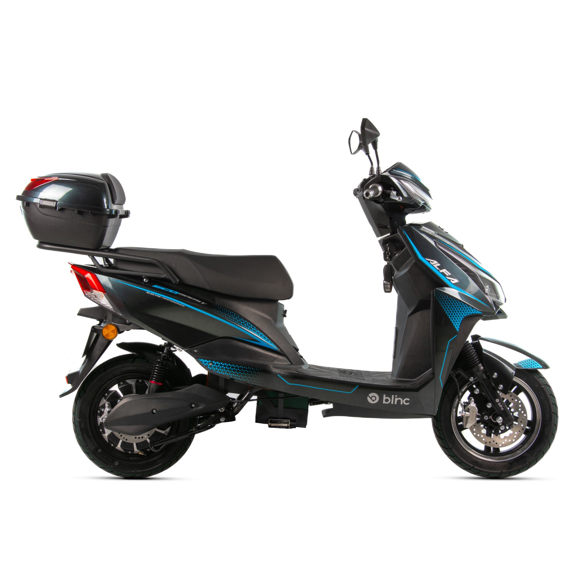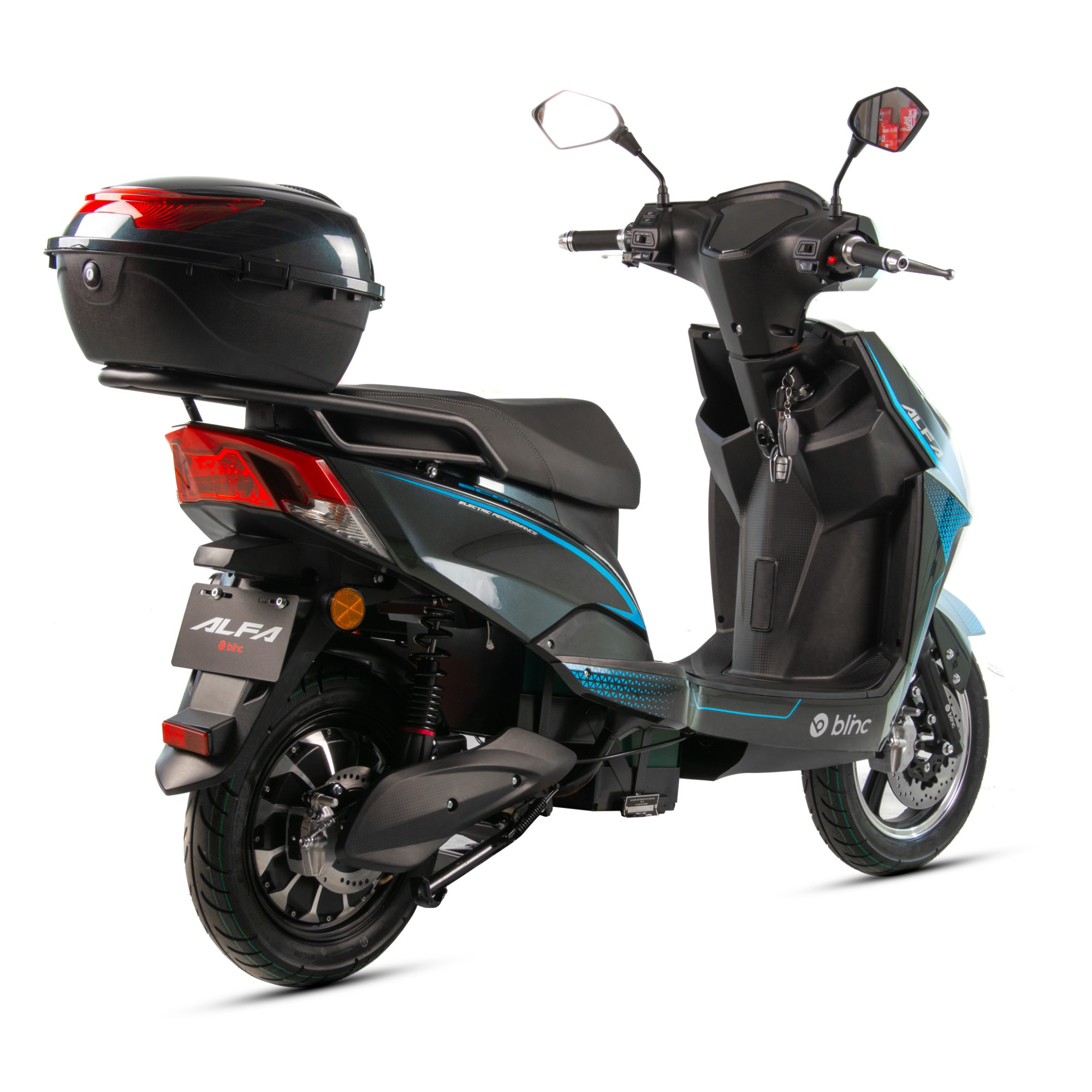 Skuter Blinc Alfa to pojazd z silnikiem elektrycznym o mocy 2000W. Zasilany jest zespołem baterii LEAD-ACID o łącznym napięciu 72V20Ah. Automatyczna skrzynia biegów wyposażona w 3-stopniową regulację prędkości. Alfa wyposażony jest w gniazdo USB, system Bluetooth, cyfrowy wyświetlacz, oświetlenie LED oraz kufer. Idealna alternatywa do pojazdów spalinowych – ładujesz i jedziesz. Zasięg na poziomie do 55km pozwoli na dojazdy do pracy, dzięki czemu zaoszczędzisz na paliwie. Doskonale sprawdzi się w miejskim zgiełku oraz poza miastem. Dynamiczny i bezobsługowy pojazd dla każdego.