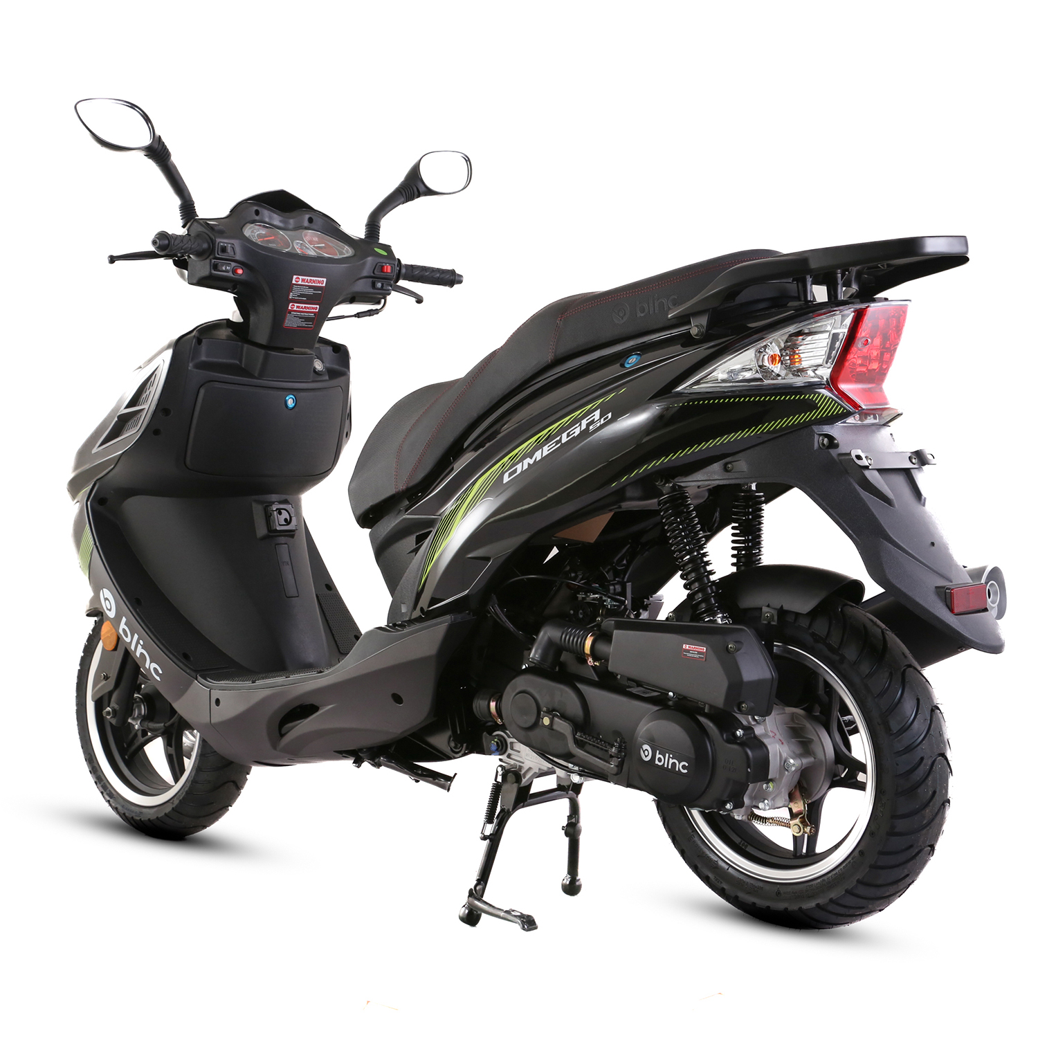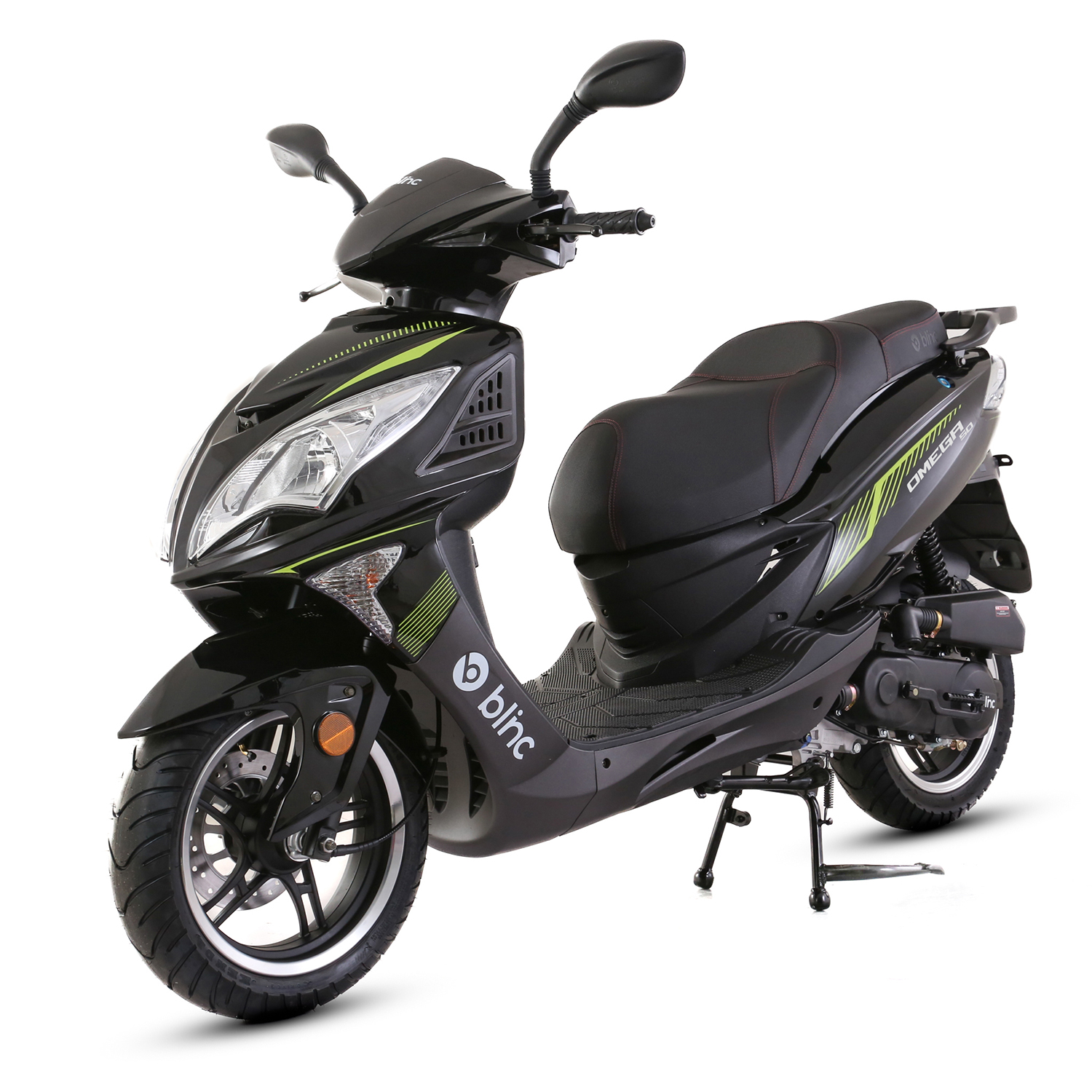 Skuter Blinc Omega 50 to typowo miejski pojazd z silnikiem czterosuwowym o pojemności 49cm3. Zestawiony jest na felgach aluminiowych – 13″ z przodu i 12″ z tyłu. Bezstopniowa skrzynia biegów CVT daje wygodę jazdy i prostotę obsługi. Możliwość odpalenia z rozrusznika elektrycznego lub „na kopkę”. Duży i dynamiczny pojazd pozwoli na łatwe przemieszczanie się w mieście oraz wygodne podróżowanie poza miastem.