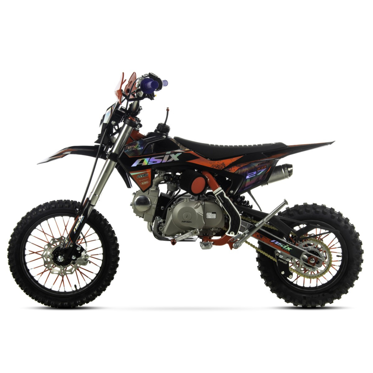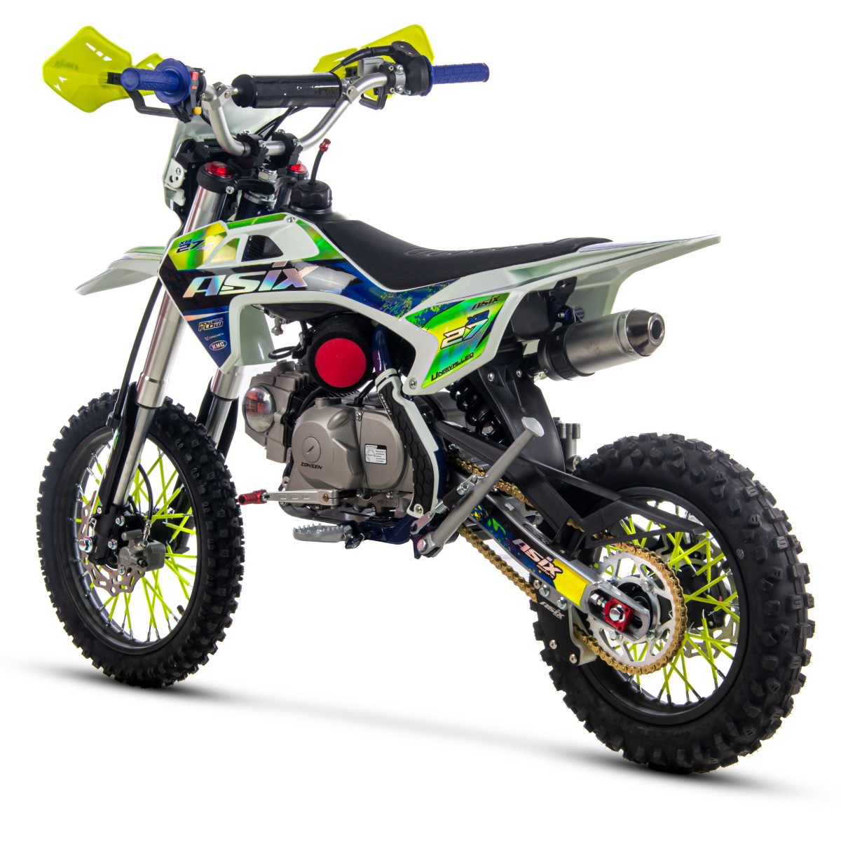 Cross ASIX XB27 w pojemności 110cm3 to pojazd z silnikiem czterosuwowym, odpalany na kopkę lub rozrusznik elektryczny. Pojazd z półautomatyczną, 4-biegową skrzynią biegów przeznaczony dla dzieci od 140cm wzrostu. Cross na kołach 14/12″ z amortyzatorami upside-down, licznikiem motogodzin, handbarami, regulacją prędkości oraz holograficzną okleiną