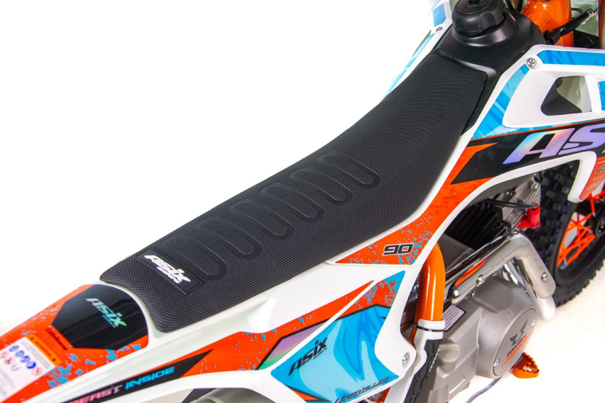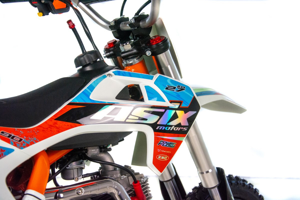 Cross ASIX XB27 w pojemności 90cm3 to pojazd z silnikiem czterosuwowym, odpalany na rozrusznik elektryczny. Pojazd z automatyczną skrzynią biegów przeznaczony dla dzieci od 135cm wzrostu. Cross na kołach 12/10″ z lampą przednią, amortyzatorami upside-down, licznikiem motogodzin, handbarami, regulacją prędkości oraz holograficzną okleiną