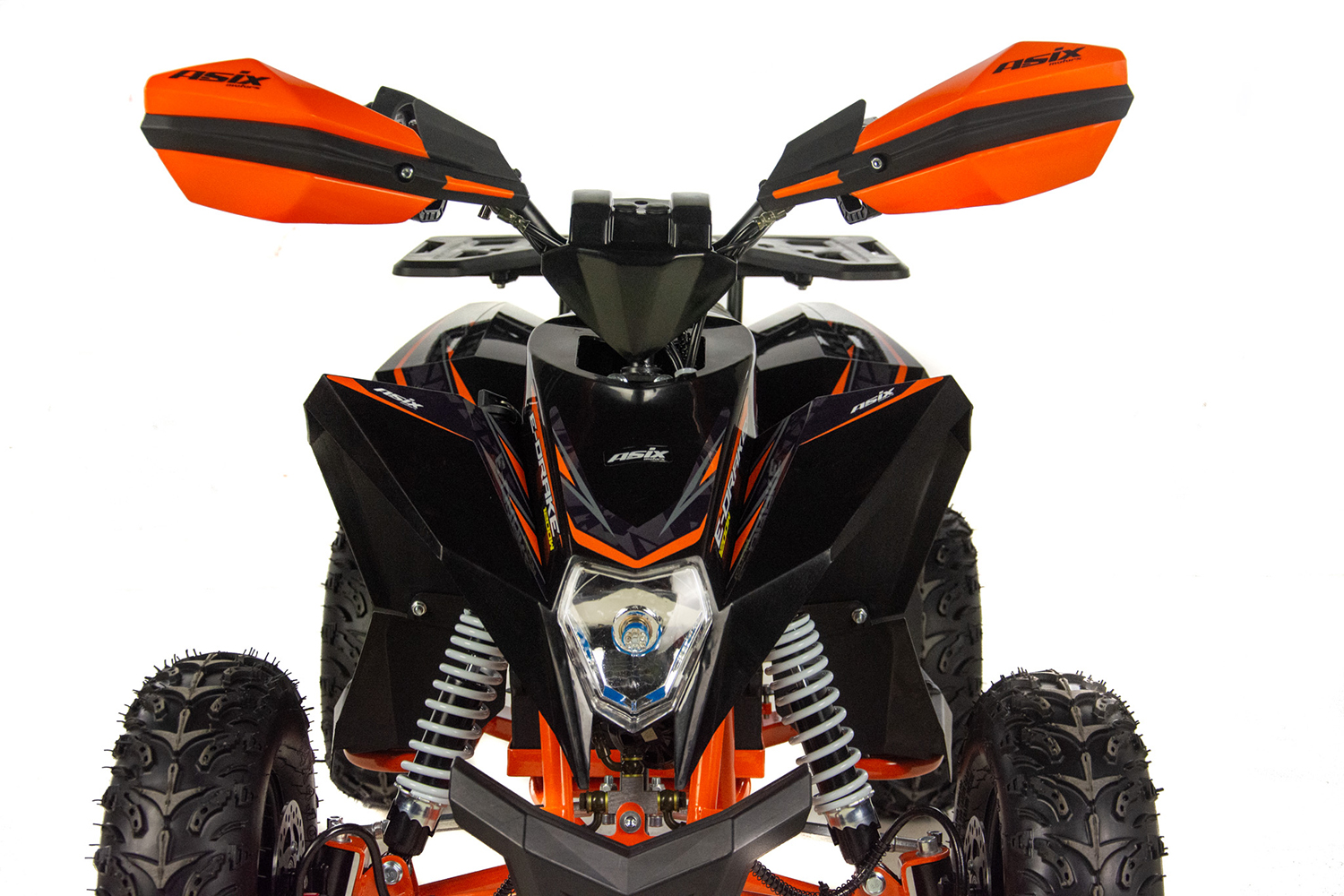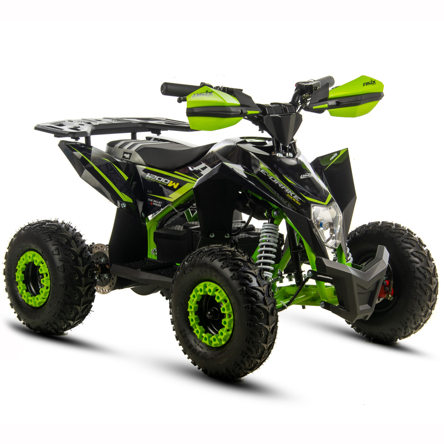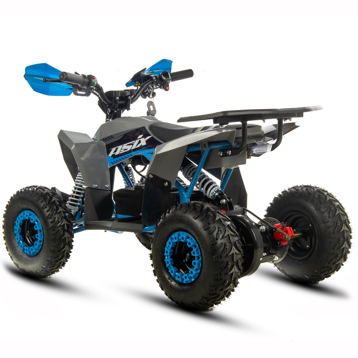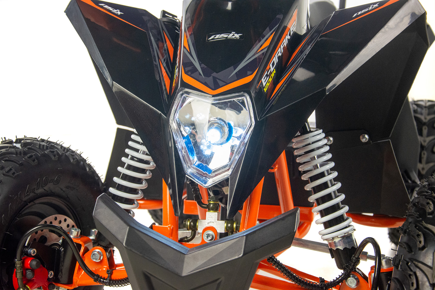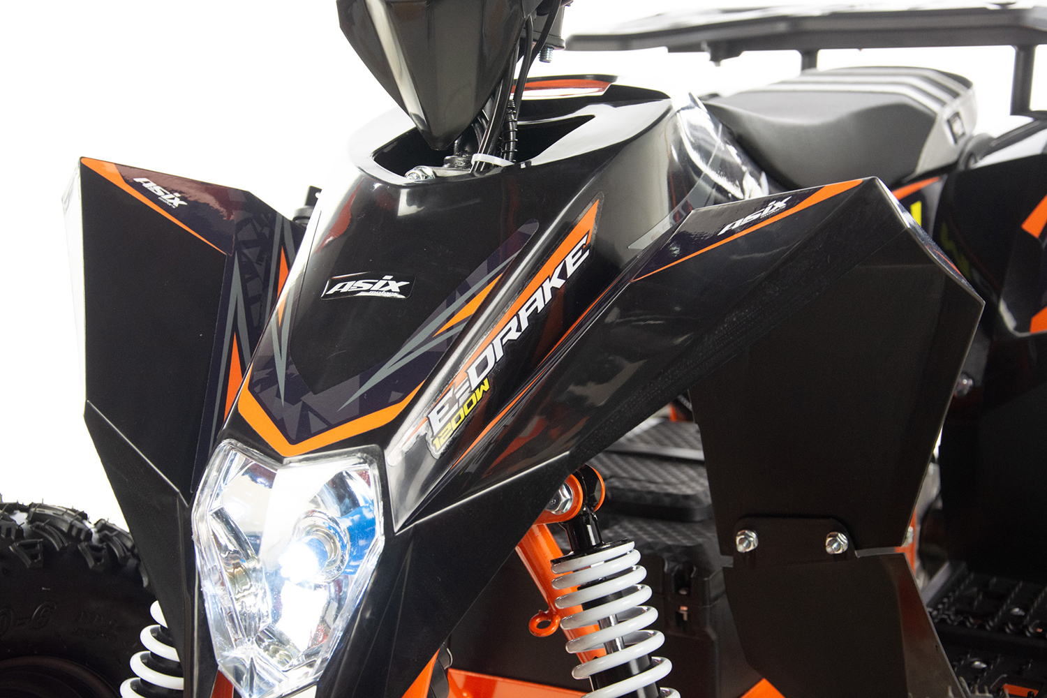 Mini quad ASIX E-DRAKE to pojazd z elektrycznym silnikiem bezszczotkowym, neodymowym o mocy 1200W. Zasilany jest zespołem baterii o łącznym napięciu 48V12Ah. Wyposażony w płynną regulację prędkości oraz regulację opóźnienia startu. Model ten posiada bieg wsteczny. Przeznaczony jest dla dzieci od 120cm wzrostu. Quad na dużych 6″ kołach, wyposażony w przednie i tylne oświetlenie LED, pilot zdalnego gaszenia pojazdu, klakson, hamulce hydrauliczne oraz olejowe amortyzatory.
