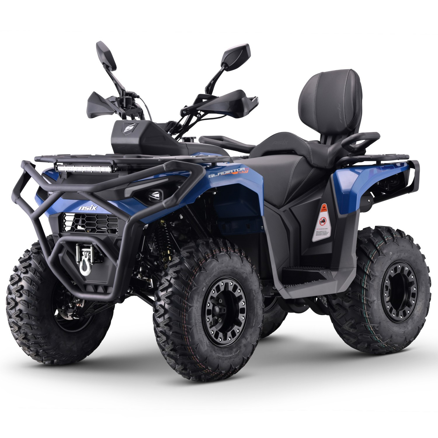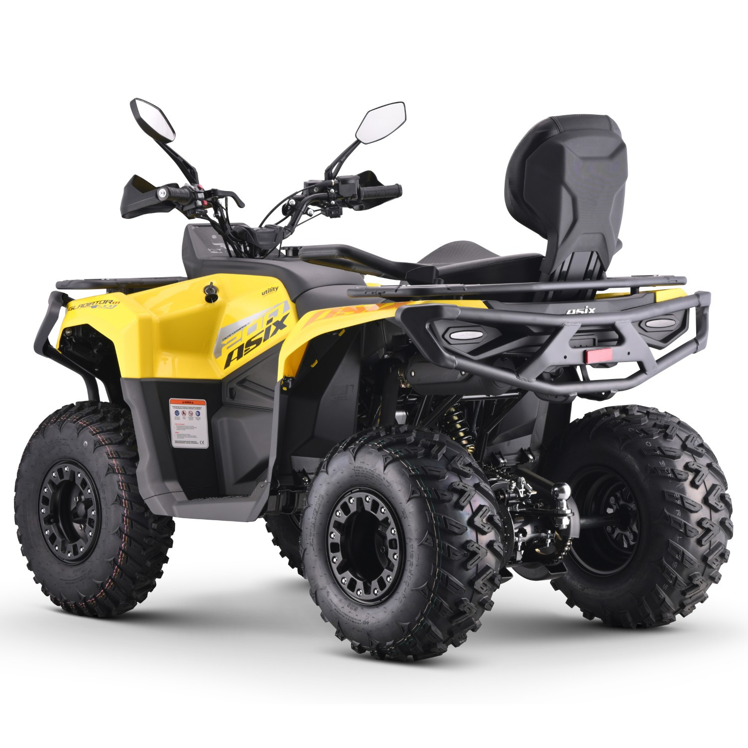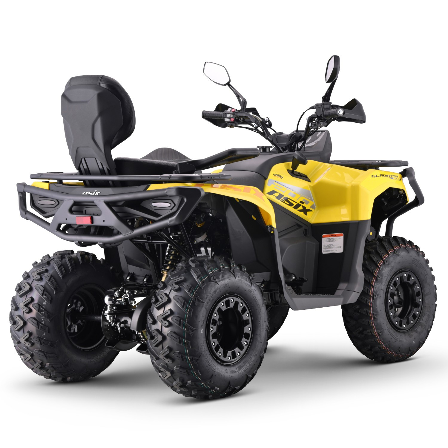 Quad ASIX GLADIATOR 200RS to pojazd z czterosuwowym silnikiem JINLANG o pojemności 180,4cm3 z chłodnicą cieczy, zasilany wtryskiem. Silnik ponadto wyposażony jest w wałek wyrównoważający, który zapewnia płynną kulturę pracy i zapobiega drganiom przenoszonym z silnika na ramę. Przeznaczony jest dla nastolatków od 150cm wzrostu. Gladiator zestrojony jest z automatyczną skrzynią biegów z biegiem wstecznym. Model posiada bogate wyposażenie, w skład którego wchodzą między innymi: wyciągarka 2000lbs, podgrzewane manetki, gniazda USB i zapalniczki, zamykany pojemnik na przednim bagażniku, pełne oświetlenie ledowe z panelem LED z kierunkowskazami, duży, cyfrowy wyświetlacz, hak, licznik motogodzin, wygodne oparcie oraz uchwyty dla pasażera, osłony na ręce, lusterka i klakson