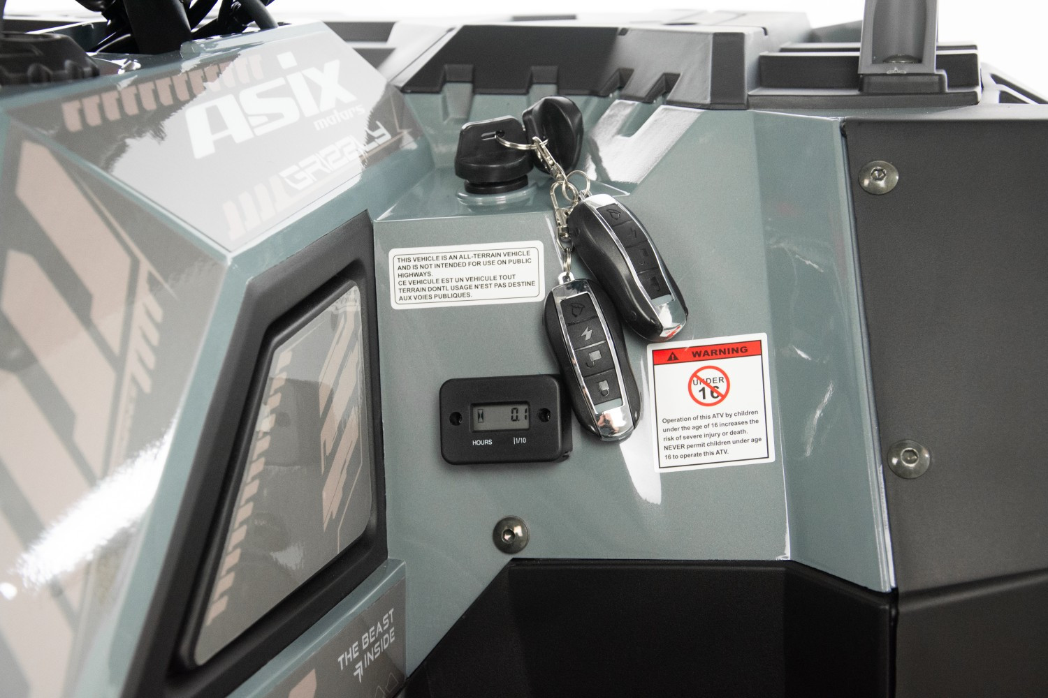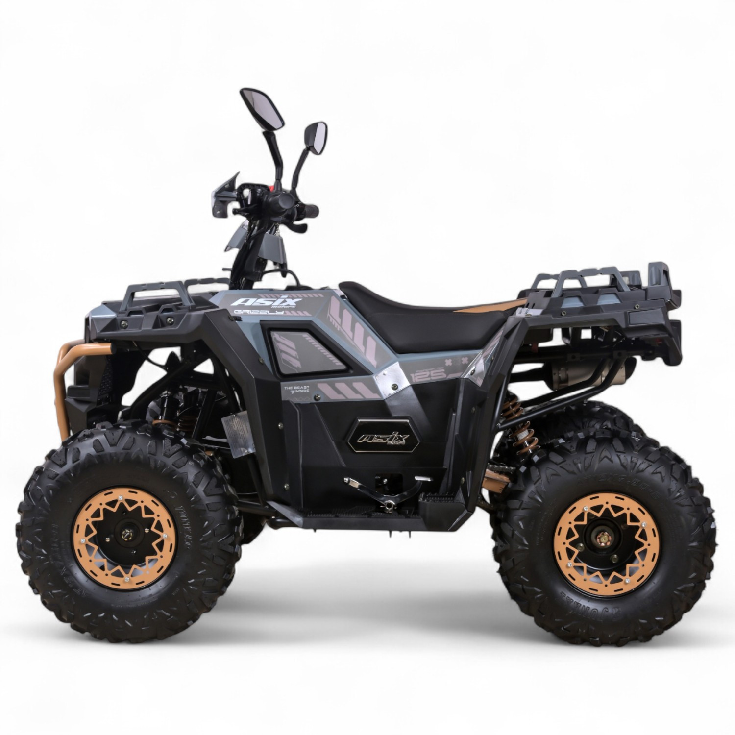 Quad ASIX GRIZZLY to pojazd z czterosuwowym silnikiem ZONSEN o pojemności 125cm3. Przeznaczony jest dla dzieci od 140cm wzrostu. Przeprawowy quad z oświetleniem LED przód i tył z kierunkowskazami, wyświetlaczem cyfrowym, licznikiem motogodzin, gniazdami USB, amortyzatorami gazowo-olejowymi, smarowniczkami na wahaczach, handabrami, lusterkami oraz pilotem zdalnego gaszenia pojazdu. Dostępny jest ze skrzynią automatyczną lub półautomatyczną z biegiem wstecznym. Zestawiony jest na kołach 8-calowych zaopatrzonych w stalowe beadlocki
