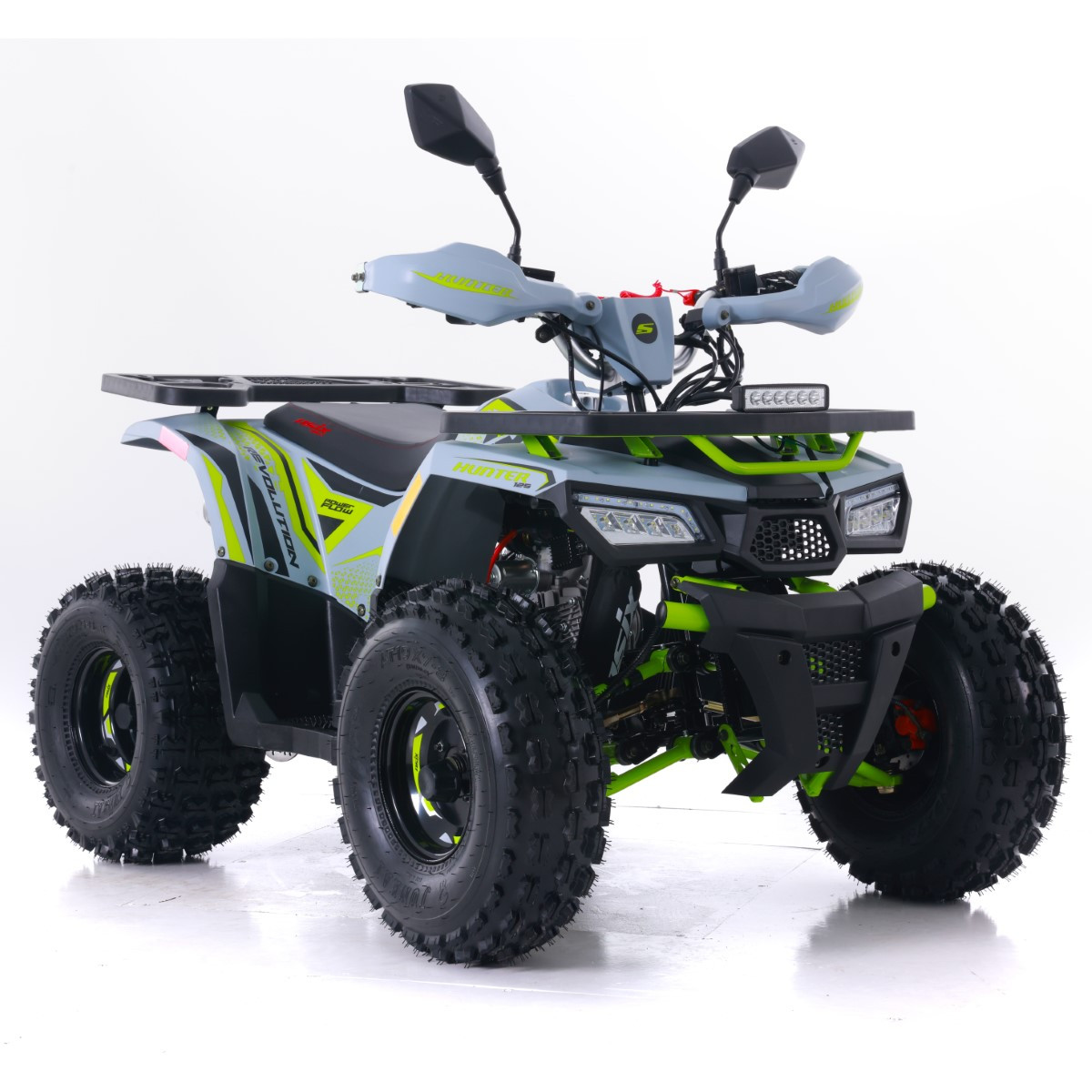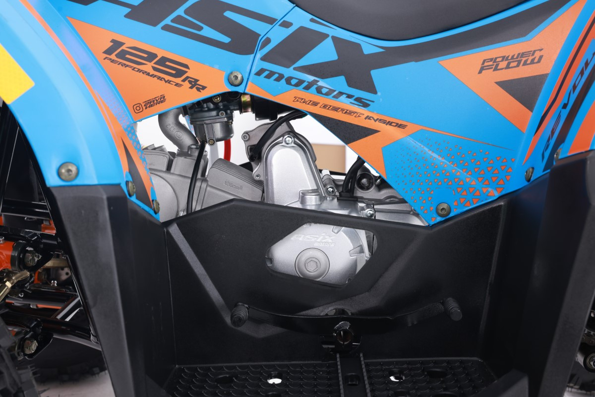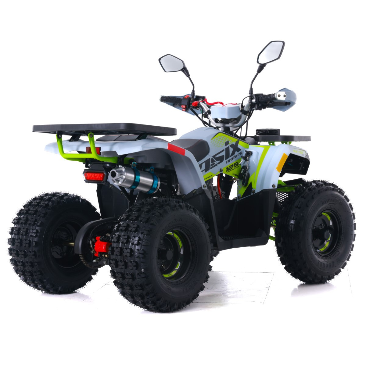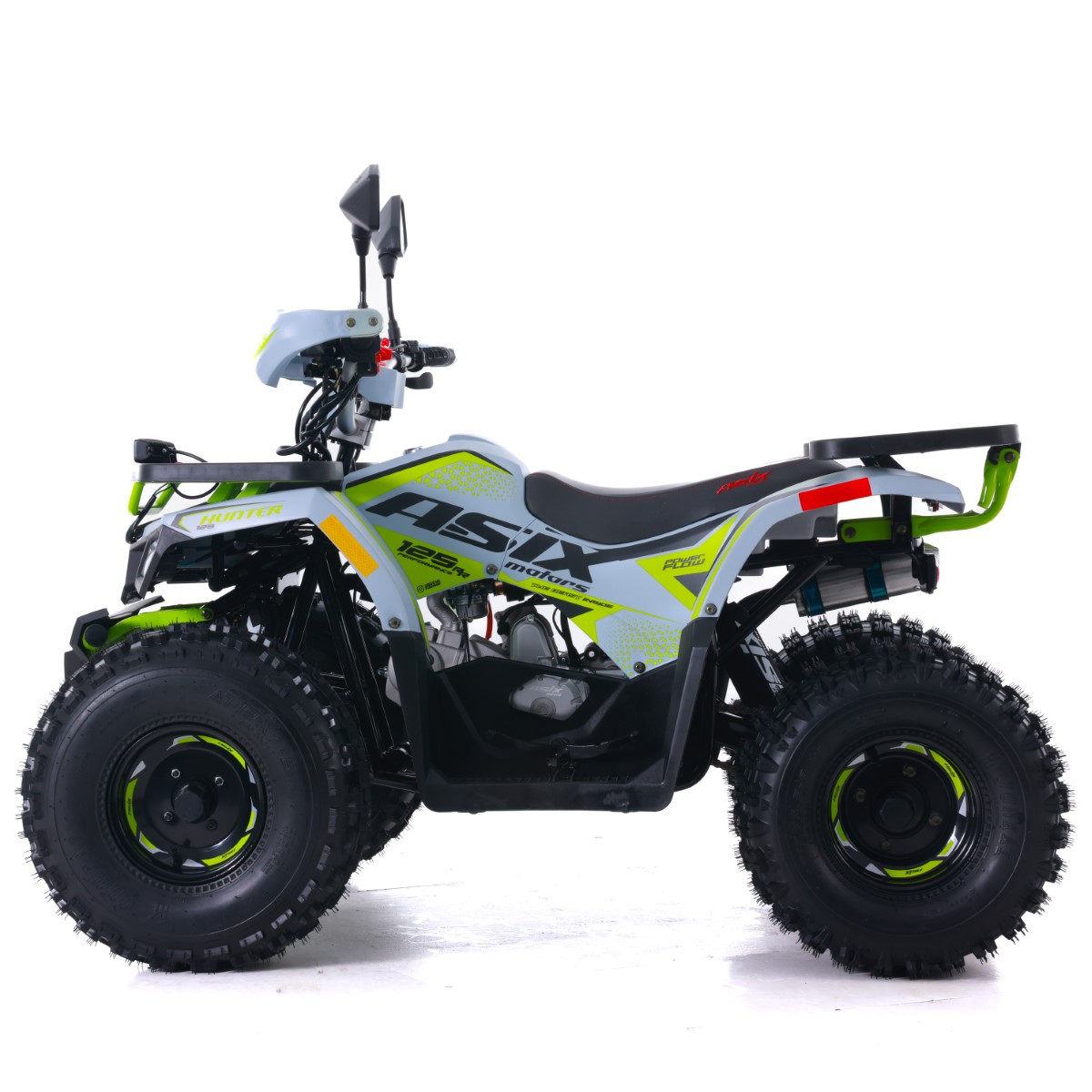 Quad ASIX HUNTER to pojazd z silnikiem czterosuwowym o pojemności 125cm3. Przeznaczony jest dla dzieci od 140cm wzrostu. Przeprawowy quad z oświetleniem LED przód i tył, dodatkowym panelem LED, licznikiem cyfrowym, licznikiem motogodzin, lusterkami. Dostępny jest ze skrzynią automatyczną z biegiem wstecznym (1+1). Zestawiony jest na kołach 8-calowych