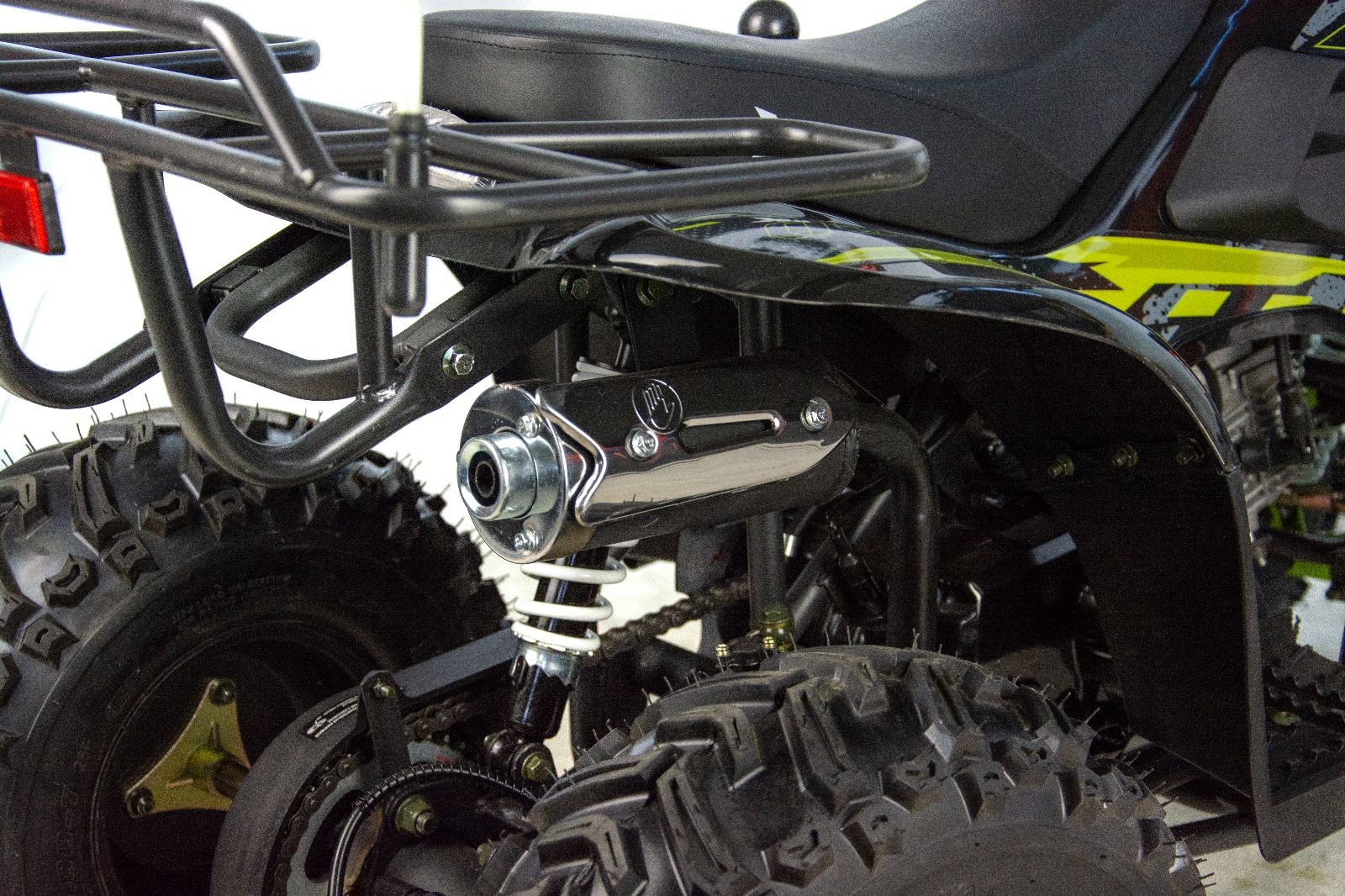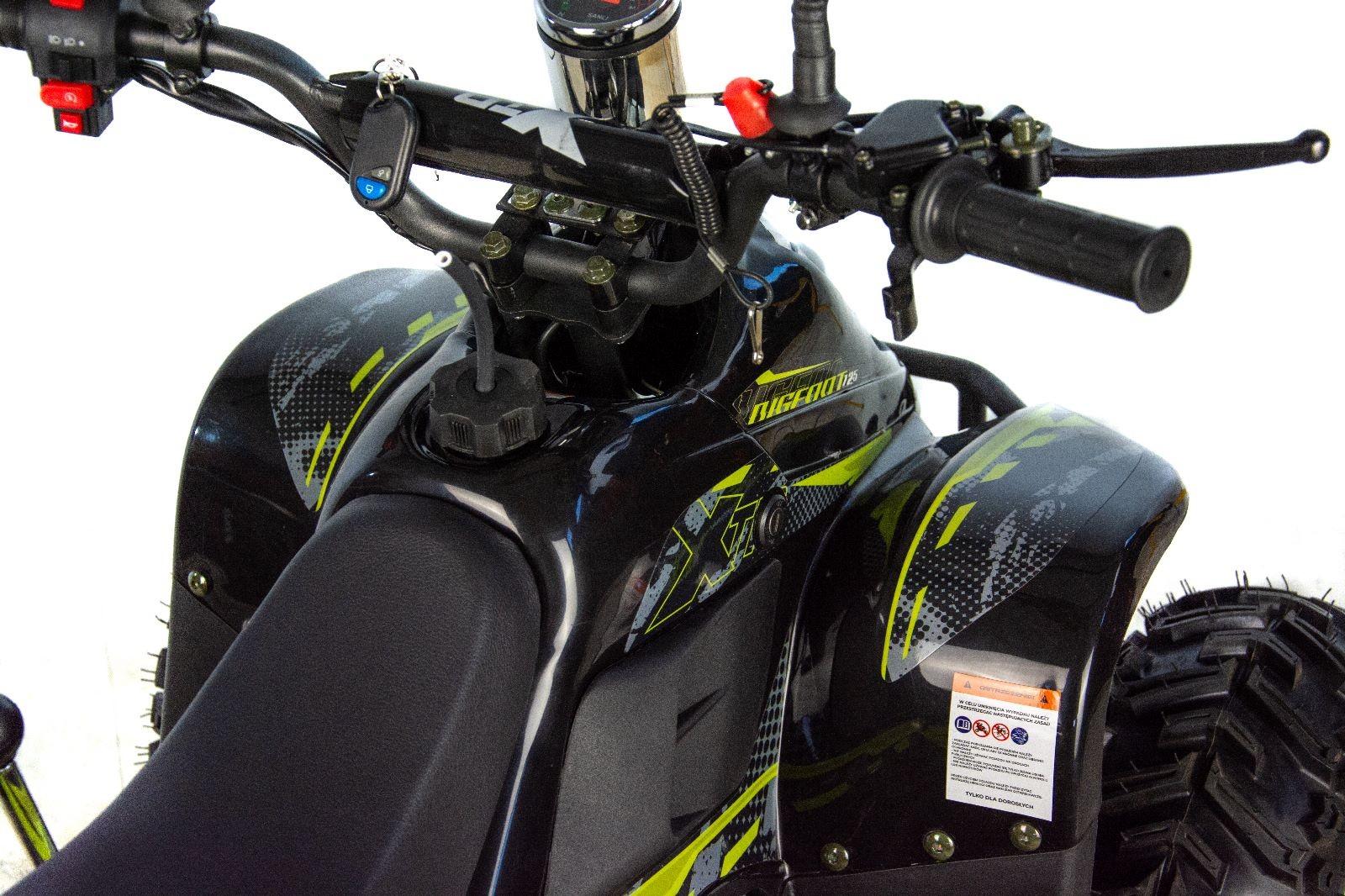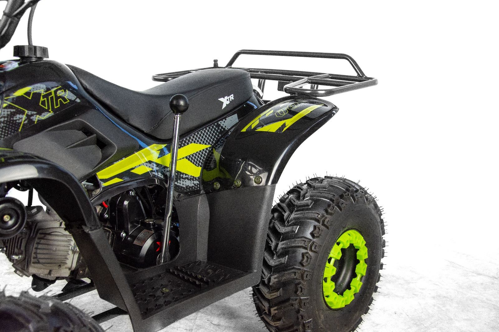 Quad XTR 001 Big Foot odpalany z rozrusznika elektrycznego to pojazd z silnikiem czterosuwowym o pojemności 125cm3 dla dzieci od 6 lat. Sportowy quad z oświetleniem przód/tył, biegiem wstecznym, zrywką bezpieczeństwa oraz regulacją prędkości na kołach 7″