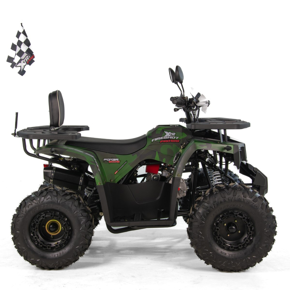 Quad XTR Fireshot PRO to pojazd z silnikiem czterosuwowym o pojemności 125cm3 dla dzieci od 145cm wzrostu. Przeprawowy quad z oświetleniem LED, licznikiem cyfrowym, licznikiem motogodzin, kierunkowskazami, oparciem, handbarami, lusterkami oraz klaksonem. Fireshot wyposażony jest w skrzynię automatyczną lub półautomatyczną z biegiem wstecznym. Zestawiony jest na kołach 8-calowych